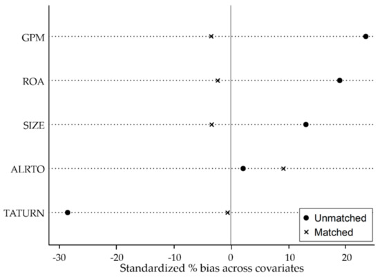 To provide more accurate results, financial companies were not included in the analysis of financial performance. The research object was the 43 non-financial companies that issued green bonds from 2016 to 2018. Based on the relevant research on PSM method, a non-alternative one-to-one nearest neighbor matching method was selected. Considering that companies issued green bonds every year from 2016 to 2018, this paper used the year-by-year matching method to find a matching control group for each year’s treatment group, which is similar to the relevant studies conducted by Blundell and Dias [71] and Heyman et al. [72]