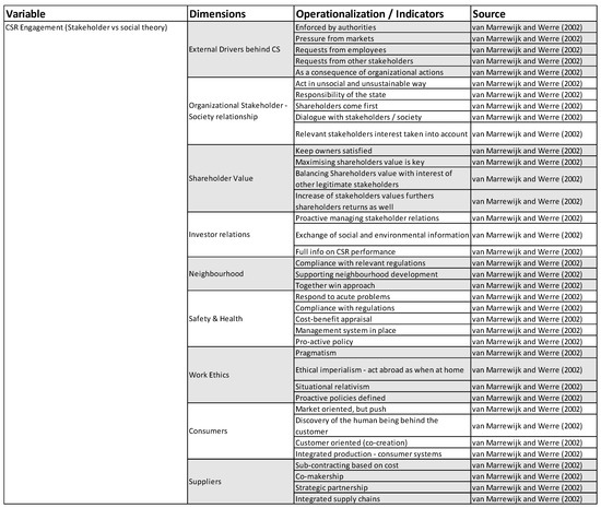 Operationalization of CSR engagement: stakeholder/shareholder theory.