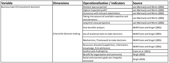 The operationalization of the investment decision was based on a study by ref [31]. In this study, it was argued that in order for firms to engage in CSR, those firms must devote resources to realizing CSR initiatives. According to ref [31], resources are assets, capabilities, organizational processes, firm attributes, information, knowledge, etc., that are controlled by the firm. Firms use these resources to generate output, which results in higher costs. Firms must do cost–benefit analyses to make critical decisions regarding the optimal use of input to generate CSR initiatives, depending on the demand for CSR initiatives and the costs associated with generating them [31]. This variable was measured through probing questions to the start-up owner about resources being devoted to realizing CSR initiatives and whether these were subjected to a cost–benefit analysis. The items in Figure 2 below were used to operationalize “investment decision”.