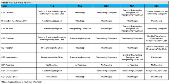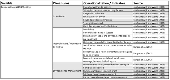 Ref [33] provided indicators for the “philanthropic” theater, the “reengineering the value chain” theater, and the “transforming the ecosystem” theater. Ref [33] gave suggestions which focused on internal drivers and motivations behind CSR. On the basis of the answers to the questions related to principle dimensions, the researchers could investigate the relationship between business values and CSR engagement. Figure 3 presents the operationalization for business values.