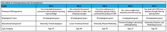 The more experienced an entrepreneur is, and the more an entrepreneur exhibits expertise, the more he or she favors thriving in the five dimensions (autonomy, innovativeness, risk-taking, proactiveness, and competitive aggressiveness) [39] and acting entrepreneurially to engage in CSR. This means that the manner in which a firm adopts and engages in CSR is related to the entrepreneur’s experience and expertise, which influence the CSR engagement of the start-up.