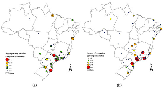 (a) Location of headquarters of Brazilian transport service provider companies interviewed, and (b) regions in which these companies perform urban deliveries.