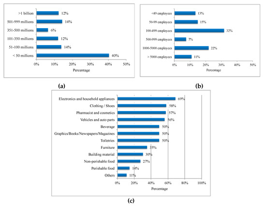 The descriptive statistics of the characteristics of the companies (revenue, number of employees, and products delivered) are presented in Figure 3. Small companies (<50 million Real of gross billing) were the majority of the sample (Figure 3a; USD 1 ≈ BRL 4). The number of employees ranged from 3 to 20,000 (Figure 3b). Electronics and home appliances were the main products delivered (Figure 3c). These data show that the companies delivered goods in the different regions of Brazil and, especially, in the large urban centers of Brazil.