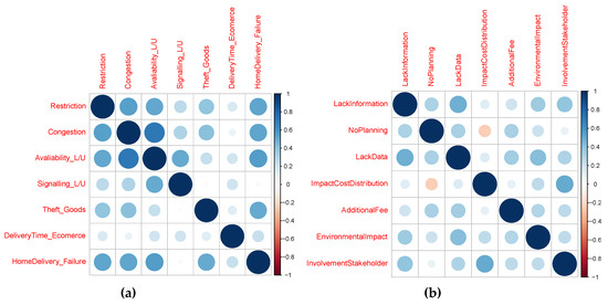The correlation between the variables in Block 4 is presented in Figure 4. The availability of L/U areas is correlated with congestion. A moderate correlation exists between restrictions on freight vehicles and (1) availability of L/U areas and (2) congestion. Home delivery failures are correlated with (1) freight vehicle restrictions, (2) availability of L/U areas, (3) congestion, and (4) theft of goods. Some of these results are easily explained—the restriction on freight vehicles causes two phenomena in Brazilian cities: the drivers arrive early (before the restriction time) and park in L/U areas; or, less commonly, start the delivery process before the restriction time. However, in some cities, like São Paulo, the restrictions include time and upper limits of vehicle size, resulting in more freight vehicles performing deliveries and contributing to congestion.