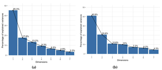 PCA was used to identify dependent variables. Firstly, we measured the suitability of the data for PCA using Kaiser–Meyer–Olkin (KMO) [68]. A value above 0.7 is considered median, and above 0.8 is considered acceptable for the KMO test [68]. Considering the sample characteristics for analysis, we used the eigenvalues to determine the number of principal components [69]. An eigenvalue greater than 1 indicates that the component accounts for more variance than accounted for by one of the original variables. This is used as a cut-off point to identify components to retain, which is valid to standard data. The total variance and analysis of the scree plot is another method to limit the number of components. A scree plot is a plot of eigenvalues ordered from largest to the smallest. The number of components is determined at a point beyond which the remaining eigenvalues are all small [70,71]. In this study, we considered the eigenvalues ordered from largest to smallest to determine the number of components. More details on PCA have been previously reported [71].