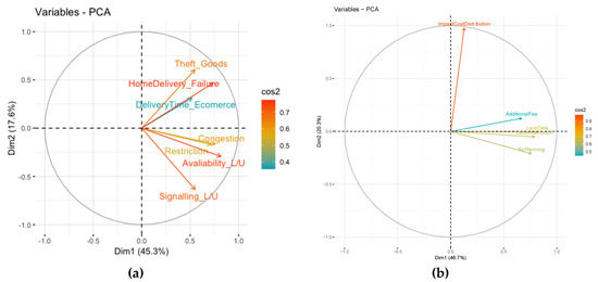 Figure 7a presents the correlation circle barriers and the representation of the variable on the PC (cos2) results. The restriction, congestion, and availability of L/U areas are positively correlated variables. Also, most of the variables have a high cos2, i.e., variables with a good representation of the PC. The freight vehicle restriction measures (Figure 7b), lack of information, lack of data, no UFT planning process, additional fees, and environmental impacts are correlated differently (environmental impacts are different from the other variables). Finally, in both cases, all the variables point to the right, correlated with this first principal component.