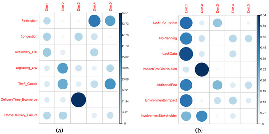 The contribution of each variable to each component is presented in Figure 8a,b. For the barriers related to UFT, restriction, congestion, and availability of L/U areas contribute to PC1 (Dim. 1 in the Figure 8a). Theft of goods and signaling of L/U areas contribute to PC2, the delivery time of e-commerce goods contributes to PC3, restrictions contribute to PC4, and theft of goods and restrictions contribute to PC 5. For the freight vehicle restriction measures, almost all variables contribute to PC1: lack of information, no planning, lack of data, additional fee restrictions, and environmental impact. The impact of distribution cost and involvement of stakeholders contribute to PC2. The dimension of the contribution of each variable is presented on the axes on the right of Figure 8a,b.