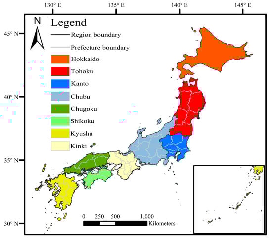 Japan is a highly developed country, having the world’s third-largest gross domestic product (GDP) []. The total population of Japan was about 127 million and the urbanization rate was about 93% according to the National Census in 2015. Japan consists of four main islands, including Hokkaido, Honshu, Shikoku, and Kyushu from north to south, and about 6848 surrounding islands. Japan has 47 prefectures, and each prefecture consists of numerous municipalities, with 1741 in total as of October 2016. Japan is traditionally divided into eight regions, and each region includes several prefectures, excluding Hokkaido (Figure 1). Four types of municipalities exist in Japan: cities, towns, villages, and special wards (the ward in Tokyo). Cities with a certain population are labeled core cities (over 200,000 residents) or designated cities (over 700,000 residents) []. In this study, a total of 1647 municipalities on the 4 main islands and surrounding isolated islands were selected as the study items (Okinawa prefecture was excluded). The municipalities were further classified into four categories based on population (Table 1).