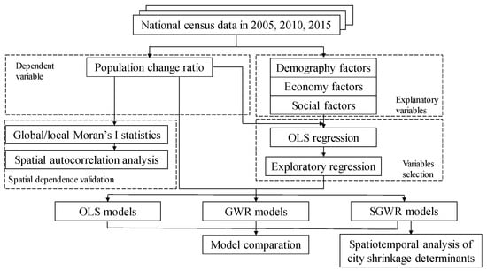 In this study, we first conducted spatial autocorrelation analysis to validate the spatial dependence of population change. Then, OLS and exploratory regressions were employed to identify correlates of city shrinkage. After that, three types of regression analyses, including OLS, GWR, and SGWR, were conducted to reveal the correlates of city shrinkage (Figure 2).