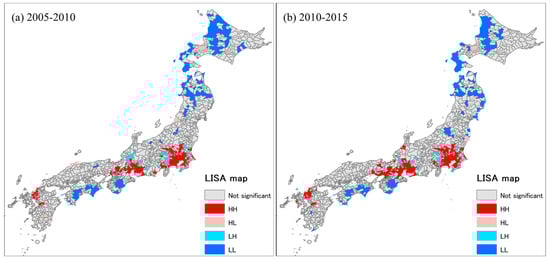 The local indicators of spatial association (LISA) cluster maps of population change (HH: high-high cluster; HL: high-low outlier; LH: low-high outlier LL: low-low outlier) (a) from 2005 to 2010 and (b) from 2010 to 2015.