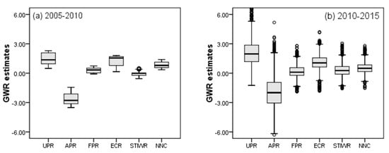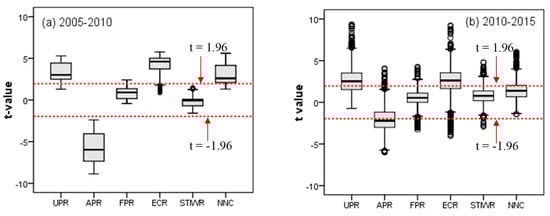 Considering the spatial heterogeneity and spatial autocorrelation of population change, GWR was applied to fit a local population change model. Figure 4 shows the parameter coefficients for the local model of the two study periods. Compared with the first study period, the variation range and the number of mild outliers of the parameters increased. The effects of the parameters could be positive or negative for different regions. Figure 5 shows the variation in parameters’ t-values for the local model. Most observations of UPR, APR, ECR, and NNC reached the 0.05 significance level for the first study period, whereas most observations of UPR, APR, and ECR reached the 0.05 significance level for the second study period.
