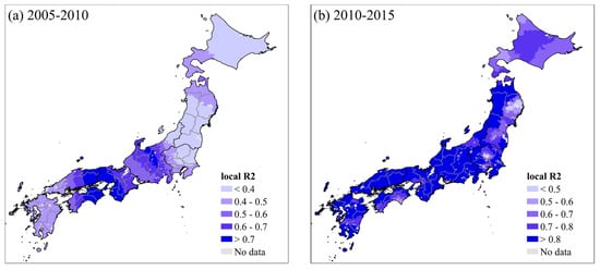 Figure 6 shows the local R2 of the SGWR model. For the first study period from 2005 to 2010, the values of local R2 for Shikoku, Chugoku, Kinki, and Chubu were relatively larger, especially in and around the Osaka city cluster. However, the values of local R2 for Tohoku and Hokkaido were relatively lower, which can be explained by the many municipalities in the two regions experiencing mergers during the first study period. From 1999 to 2010, a wave of merger activity occurred called ‘the great Heisei mergers’ as a response to the low fertility and ageing population. The number of municipalities decreased from 2521 in 2005 to 1727 in 2010. As the merge between municipalities led to a population explosion for those municipalities, the interpretation of the SGWR model for this period was affected, producing a moderate result (adjusted R2 = 0.532). However, since 2010, the municipality mergers ceased and little change occurred in the administration districts from 2010 to 2015, explaining the high value of local R2 in most regions in Japan during this period.