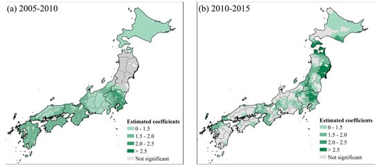 Figure 8 shows the coefficient of the ageing population effect on population change from 2005 to 2010 and from 2010 to 2015. In the first period from 2005 to 2010, only 10 municipalities did not pass the significance test, whereas the other municipalities were found to have a negative correlation between UPR and population change, which suggests the ageing population is correlated with driving city shrinkage nationwide. However, the estimated coefficient of UPR varied between regions. Kyushu and Kanto were the regions with the largest UPR estimated coefficients. The ageing phenomenon in Kyushu was serious, especially in the south, which has aggravated the city’s shrinkage. Conversely, in Kanto, centered in Tokyo, the labor force continuously migrated inward and the proportion of the elderly population continued to decline, which has caused urban expansion in the region. The city shrinkage in the distant periphery and suburban areas occurred due to the ageing populations and infrastructure that has become inadequate [,]. From 2010 to 2015, the area of the ageing population effect shrunk and negative coefficients were found in 935 municipalities mainly concentrated in Kyushu, Chubu, and Chugoku. However, positive coefficients were found in 45 municipalities in south Tohoku and south and north Hokkaido, which could be due to the aggregation of the elderly population and population ageing.