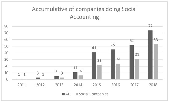 Social companies are those companies belonging to the social economy. Those companies do have an economic activity, but their objective is purely social, so the measurement of the social value should be more important than that of the economic value. Nevertheless, the only way they have to measure their impact is through the economic criteria that traditional accountancy provides. As the size of this third sector grows, the demand to have indicators or methodologies to measure their social value and social impact grows. Social value is the quantification of the relative importance that people place on the changes they experience in their lives. Some, but not all, of this value is captured in market prices. It is important to consider and measure this social value from the perspective of those affected by an organization’s work. Social impact is the effect that an organization’s actions have on the well-being of the community. The methodologies and indicators for the social economy sector have not yet been widely recognized, neither in the economic nor in the academic field [10,11]. At present, there are some methodologies to measure social value but there is no methodology parallel to traditional accounting, as none of them follow the same rules and logic, so we have focused on the need for social accounting. We can define social accounting as ‘‘a systematic analysis of the effects of an organization on its communities of interest or stakeholders, with stakeholder input as part of the data that are analyzed for the accounting statement’’ [12]. The polyhedral model is the social accounting model developed by ECRI (Ethics in Finance and Social Value, University of the Basque Country), which we used to quantify social value. This model is supported by GEAccounting, a non-profit group that promotes and performs its use. It permits the monetization of social value and takes into consideration all actors [13,14]. It follows the same rules and logic as it is based on real data, and the results are presented in the same language as that of traditional accounting, in monetary units and ratios. The aim of social accounting is to be complementary to traditional accountancy. As we can see in Figure 1, many organizations have already done social accounting with the polyhedral model since 2011, being mostly social companies.