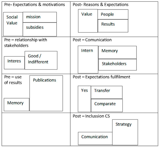 All the analyzed 20 companies are organizations that belong to the social economy sector. Ten of them are committed to do the calculation of their social value with the polyhedral model (PRE), and ten of them have already finished the process (POST); furthermore, some of them have been calculating it for years.