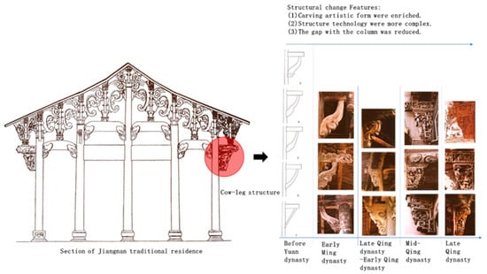 In the Jiangnan Region of China, the construction technology, and the culture of gardens and water towns in traditional villages have resulted in high-quality artistic value, culture, and environmental sustainability [7]. Local materials such as wood, bricks, stones were used in the building envelopes, effectively sheltering the wind and rain while sculptures embedded in these materials have gradually matured to highly recognizable local architectural features and a remarkable cultural symbol in Jiangnan region, a legacy that largely constitutes what is known as Jiangnan Minju (“江南民居”), also called Jiangnan traditional residences or Jiangnan dwellings [8]. For example, throughout a long history, the cow-leg structure [9] has been used to provide support to the roof and to transfer the load to the columns in the traditional architectures in the Jiangnan villages. It was simple and purely designed as a structural component before the Yuan Dynasty (see Figure 1) [10]. Since then, it has gradually evolved into a structural form largely enriched by the artistic and cultural connotations (Figure 1), obviously with historical signature of the dynasties (Ming, Qing, and Republic of China) coming after the Yuan Dynasty: While the structural function is maintained, the artistic expression of this interesting building components has gradually become more complex and detailed, more connected with the local cultures. While effectively maintaining the uniqueness and characters of local culture, these forms are buildable with low-tech construction strategies and are economically cost-effective. As a specific symbol of culture, the traditional residence has a positive influence on construction activities in a long history. Therefore, it is very beneficial for sustainable development if the knowledge, design and build methods that come from traditional culture are employed in contemporary architectural design. This research is aimed to develop this understanding through analyzing the artistic spatial form of Jiangnan traditional villages, and the mechanism of enrichment in which the local culture has been survived continuously for generations.