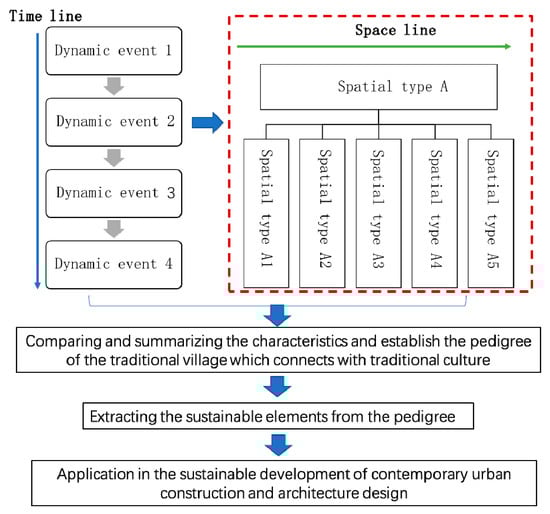 This study employed two methods for establishing an architectural pedigree, which is imaged and visualized features of the traditional culture [23,24,25,26] (Figure 2), namely DSA (dynamic spatial analysis) [27,28] and SSA (static spatial analysis) [29,30]. Through exploring historical milestone achievement along the timeline of architecture with a focus on the interaction between architecture and culture, the DSA method aims to investigate the evolution of architecture in different historical periods with regard to both social, cultural, and technological aspects and to obtain knowledge on how the experience from the past can be adapted for future applications. Information related to the diagrammatic representation of geographical changes, historical construction activities, and the cultural character was collected through historical literature reviews, archives of traditional villages, and big-data analysis. Through DSA, we aimed figure out the reason why Jiangnan traditional culture can develop continuously in the unstable social environment.