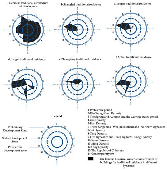 The DSA based pedigree of traditional villages indicates that although the traditional types of residences in the Jiangnan Region featured the traditional Chinese culture and were developed along with Chinese history, the dynamic changes in all periods show significant differences. However, the historical development features of traditional residences still show many commonalities, which allow for traditional culture to survive in an unstable environment and promote the construction technology evolution. Before Yuan Dynasty (before 1368AD) the development of Jiangnan traditional residences was mainly influenced by the migration from northern China. After Ming Dynasty (after 1644AD), the foreign cultures (e.g., southern Asia, Europe) [44] have gradually developed increasing impacts on the design and construction of residences in Jiangnan Region. Industrialization, although limited and sluggishly progressed, largely changed the tectonics, artistic expression, and cultural representation in architecture, resulting in a very long period of transition, through which the Chinese traditional residences were gradually transformed into a modernized version [45,46].
