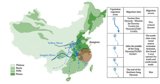 Firstly, in response to the natural disasters and the wars, five large-scale populations migrated from the north to south in the history of China [48] (Figure 4). In this process, Jiangnan Region became an important destination for large-scale migration, it not only enhanced the population and labor force of the region but also stimulated trading via both land and water-ways with Suzhou and Shanghai becoming major trading ports [49]. Among the migrants are bureaucrats, literati, merchants, and craftsmen who brought the necessary cultural development conditions such as advanced knowledge, education, and production technology to Jiangnan Region. After the construction of the Grand Beijing-Hangzhou Canal in Sui Dynasty (581–681AD), the trade between the north and Jiangnan became busy, which was vital for promoting economic prosperity, thus sustaining traditional culture development.