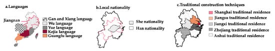 The cultural landscape of Jiangnan Region. (a) The coexistence of local nationality. (b) The unification of language and character. (c) Diversified construction techniques.