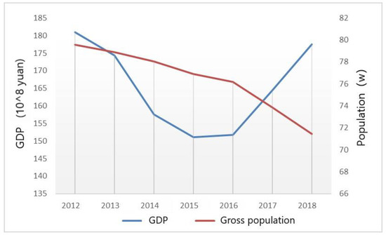 Yichun City is located in the northeast of China (Figure 1) and is China’s largest resource-based city, with the development of forest resources being its leading industry. The development of forest areas in Yichun began in 1948. Around the development of local forest resources, large-scale pillar industry systems such as forest management, timber production, and wood processing were gradually formed. However, given the long-term, high-load logging, Yichun now faces the dilemma of the depletion of forest resources and industrial decline. On March 17, 2007, the Chinese government confirmed the city to be one of the first 12 resource-exhausted cities in the country, and regarded it as the first pilot project for the economic transformation of forest resource-based cities. In 2011–2013, Yichun stopped its major logging and its annual timber production was reduced in one step, leaving only 330,000 cubic meters of logging to continue. Commercial harvesting was completely stopped in December 2013. Since then, the economy and population of Yichun City have been severely affected. The total population of Yichun’s urban area dropped from 795,632 in 2012 to 714,269 in 2018, with a total loss of 81,363. The city’s GDP fell to its lowest point in 2015 (Figure 2), and the proportion of its secondary industry also fell from 32.6% to 21.64%. According to the Shrinking Cities International Research Network (SCIRN), the definition of a shrinking city is that of a densely populated urban area with a minimum population of 10,000 residents that has faced population losses in large parts for more than two years and is undergoing economic transformations, with some symptoms of a structural crisis [12]. In recent years, Yichun City has faced the absolute loss of population and the crisis of a severe economic recession. As such, Yichun may be taken as a typical city for the purposes of studying the urban shrinkage of China’s cities.