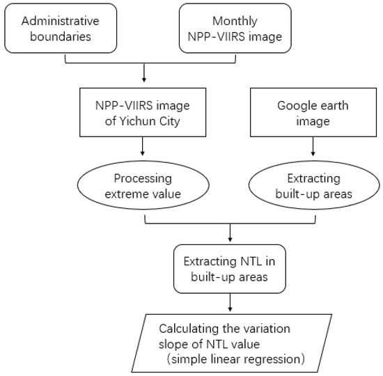 Flowchart of National Polar Orbiting Partnership (NPP)-Visible Infrared Imaging Radiometer Suite (VIIRS) nighttime light (NTL) data processing.