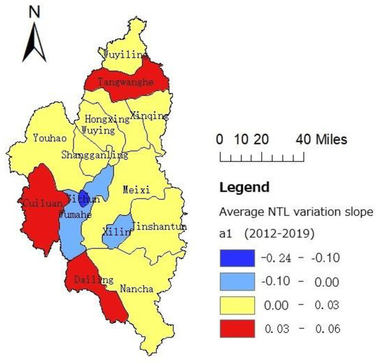 Average variation slope of NTLs on a sub-district scale in Yichun.