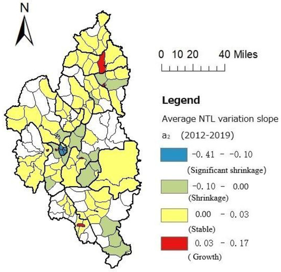 The districts that have grown steadily are Tangwanghe District, Cuiluan District, and Dailing District, located in the northern, central, and southern parts of Yichun City, respectively. The growth rate of these three districts did not emerge as significant. The forest resources in Tangwanghe District are relatively abundant, with the average slope of the monthly average NTL radiance value demonstrating the growth rate of this district to be the most marked, with a value of 0.057 nanoWatts/cm2/sr. The Dailing district had the second highest rate of growth, at 0.056 nanoWatts/cm2/sr, while the growth rate of Cuiluan District was relatively small, at 0.031 nanoWatts/cm2/sr. In the three districts manifesting shrinkage, Yichun District, the economic center of Yichun City, was found to have the most severe shrinkage. The average monthly mean light fluctuation slope of the whole district emerged as −0.238 nanoWatts/cm2/sr. The population change data of Yichun District also provided evidence of the shrinkage of the district. From 2012 to 2017, the total population of Yichun District decreased from 162,066 to 15,850; in particular, after 2014 the population fell rapidly, and the annual population loss exceeded 1000. The overall shrinkage degrees of Wumahe district and Xilin district were found to be relatively light, with average monthly variation NTL slopes of −0.011 nanoWatts/cm2/sr and −0.014 nanoWatts/cm2/sr, respectively. From 2012 to 2017, the population of Wumahe District and Xilin District was seriously depleted, with net outflows of 3000 and 5740, respectively.