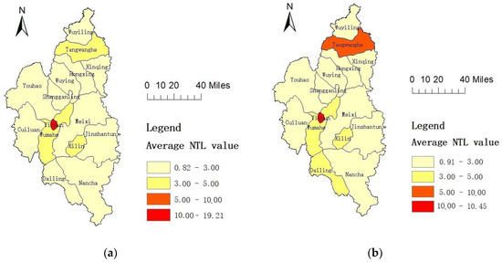 Average NTL radiance value in various areas of Yichun during (a) the year 2013; (b) the year 2018.