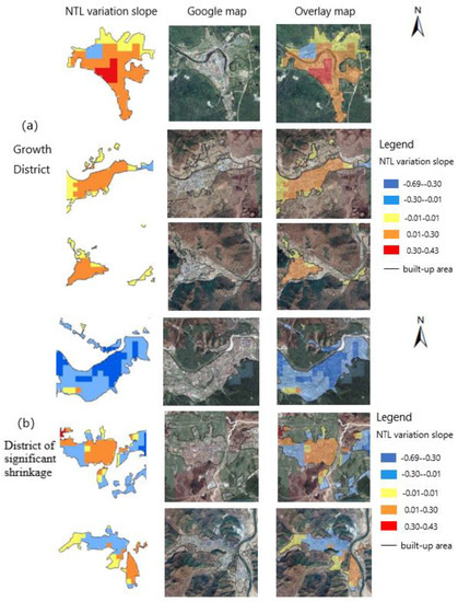 This paper also combined high-resolution satellite imagery and socio-economic data in the process of using nighttime lighting data to identify urban shrinkage patterns. The severe population loss in the shrinking area shows that the NPP-VIIRS NTL data contain a certain objective reality in identifying urban shrinkage, which lays a foundation for further utilizing NTL data to identify urban shrinkage. In addition, given their greater degree of spatial detail, these data proved to be more applicable for accurately identifying the distribution of shrinkage, and exploring the shrinking reasons behind this, when overlaid with Google satellite imagery in the analysis.