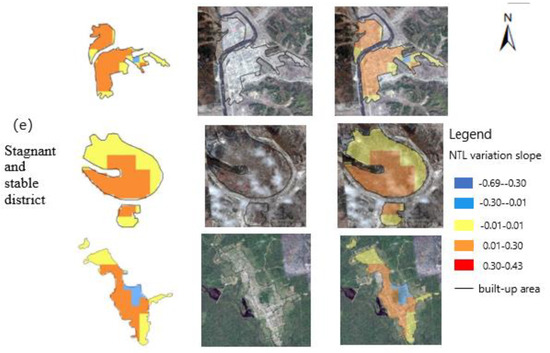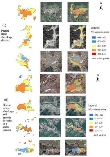 Due to the scattered distribution of the built-up areas in forest farms, some of these areas are not shown in the overlay analysis demonstrated in Figure 6. The slope of the change in the NTL radiance value of forest farms mostly shows stagnant development, with some farms characterized by mild shrinkage. The reason for this is that the slope of these areas where the NTL value emerged as weak is also relatively small. However, according to the field investigation, the main functions of the existing forest farms are forest protection and multi-forest management. With the implementation of the shed renovation project, many forest farms have been withdrawn and merged, and the population of each forest farm has decreased sharply, making the shrinkage actually very significant. Therefore, we can conclude that the slope of the NTL radiance value is small, corresponding to the weak area of the NTL value, and that there is a phenomenon of the slope of the NTL change underestimating the shrinkage condition of the weak NTL value area.