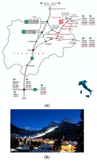 The small-scale event considered in the analysis is the JWC2019. Val di Fassa is located in the Trentino region of Italy (Figure 2a), in the heart of the Dolomites, a mountain range which has been declared a UNESCO World Heritage site. The Ladin community has learned how to safeguard its own language as well as the sustainability of the environment. The tradition of hospitality (55,000 beds and 4.4 million overnight stays) [] has deep ties to this land: The facilities are state of the art, the services efficient and the range of things to do is wide and well considered. Val di Fassa is one of the capitals of international skiing thanks to more than 200 km of slopes for Alpine skiing. At the heart of the Dolomiti Superski carousel, the largest in the world, the skiing area is one of the most advanced, with the latest ski lifts, guaranteeing the maximum amount of ski time during the season.