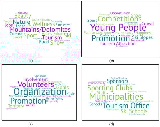 Resident focus group perceptions (a) Val di Fassa in words; (b) JWC2019 in words; (c) the “must haves” for a sports event; (d) stakeholders in JWC2019.