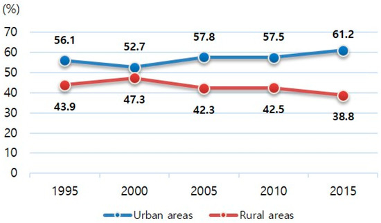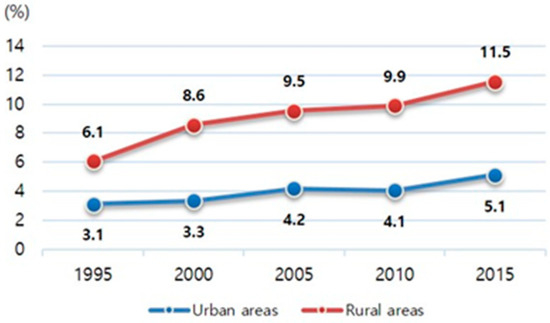 In South Korea, the number of vacant houses in 2015 was 1.07 million, which accounts for 6.5% of total housing stocks (Figure 1) [15]. Considering that the figure was about 0.4 million in 1995, when empty houses first began to be counted, this increase in the number of empty homes in 20 years is quite large. In addition, it is estimated that the number will exceed 3 million which will account for 10% of all residences by 2050 [16]. The ratio of vacant houses in rural areas compared to the total number of houses is higher than that in urban areas (Figure 2). Comparing to the total vacant houses, however, the ratio of vacant houses is higher in urban areas than in rural areas and the percentage gap has gradually widened since 2000 (Figure 3). It can thus be said that the problem of vacant houses in rural areas is more serious than that in urban areas in terms of quality. Nonetheless, the continuous increase in the share of vacant homes in urban areas may imply that housing vacancy is no longer a matter solely for shrinking cities and rural areas, and pose potential risks for dynamic urban environments.