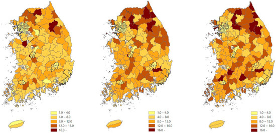 From 2000 to 2010, as shown in Figure 5, the number of empty houses increased mainly in Gyeonggi Province, surrounding the capital Seoul, and Gyeongsang Province, located in the southeastern part of Korea (Figure 4 and Figure 5). Eight out of the top ten regions with the highest number of empty homes are in Gyeongsang Province. On the other hand, the vacant housing rate increased intensively in regions in Gangwon Province, where many mountainous and fishing villages are located (Figure 6). Half of the top regions with high empty housing rates are in Gangwon Province. Between 2005 and 2010, there was a noticeable increase in the housing vacancy rate in Jeolla Province, in the southwestern part of the country, where many agricultural areas are distributed.