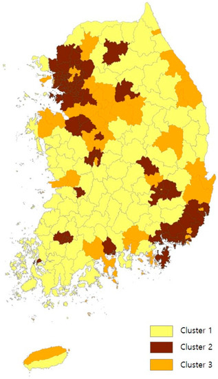 Cluster 1 is a group which has the highest ratio of vacant houses. There are 89 regions in the group, and 75 of them are Guns with strong rural characteristics; the remaining 14 regions are small local cities with a population of up to 130,000. As shown in Table 3, the ratios of elderly population, detached houses, and aged housing of Cluster 1 are significantly higher than those of the two other clusters. On the other hand, the population size and number of businesses are decreasing. According to the Special Act on Promotion of and Support for Urban Regeneration, the major indicators for determining urban decline in South Korea are decrease in population size and businesses, and the ratio of aged buildings older than 20 years [36]. Cities which meet two or more of the three sector indicators are classified as declining cities. In Cluster 1, the average rate of aged housing is about 30% and the highest is 48%. The population has decreased in 78 regions, which account for 88%, over five years (2005–2010) and the number of businesses in 46 regions has declined over three years (2007–2010). Thus, Cluster 1 can be specified as a ‘declining city type’.