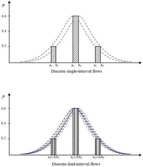 Table 1 presents the initial water demand and the economic data to each user in the three planning periods. Economic coefficients and are represented as intervals. Table 2 shows the expansion options (k) and the amounts of expected water for capacity expansion () for the three users in each planning period. Table 3 lists regulated outflows from the reservoir (expressed as dual intervals) and their associated probabilities. Assume that the probability distributions of the outflows are the same in each planning period, and the out-layer values of the dual intervals are more reliable than interiors (more confidence from the stakeholders). According to Joslyn, C. [41], each dual interval can be transformed into a class of random intervals with relevant probabilities. The bounds for the mean of these random intervals can then be obtained (Figure 5).