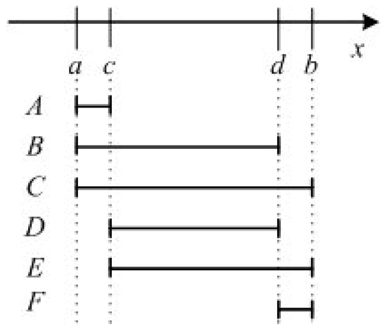 However, dual uncertainties may exist when the available information for the boundaries of interval parameters cannot be acquired as deterministic values. For example, the reservoir outflows () in Model (16)–(18) are expressed as intervals ((a1, b1), (a2, b2), (a3, b3)) with deterministic boundaries (a1, a2, a3, b1, b2, b3). Nevertheless, the lower and upper bounds of the intervals may not be known with certainty, leading to dual uncertainties. Thus, the concept of a dual interval (i.e., ((a1, c1), (d1, b1)), ((a2, c2), (d2, b2)), ((a3, c3), (d3, b3))) is proposed to reflect such dual uncertainties. With uncertain boundaries, an infinite number of intervals (single) derived from each dual interval could exist. For example, the lower and upper bounds of a dual interval ((a1, c1), (d1, b1)) may be valued as intervals (a1, c1) and (d1, b1), respectively. Then, the lower bound would take any value between a1 and c1, and the upper one between d1 and b1. Therefore, there would be infinite single intervals derived from this dual interval. When the reservoir outflows are expressed as dual intervals ((a1, c1), (d1, b1)), ((a2, c2), (d2, b2)), and ((a3, c3), (d3, b3)) (each with a probability of occurrence), complexities will then exist. The difference between single and dual intervals for the reservoir outflows can be visualized in Figure 2. Joslyn, C. [41] proposed a method to simply simulate a dual interval ((a, c), (d, b)) in a class of random intervals (interval-valued random variables). According to the available information, ten types of potential conditions can be derived from combinations of four endpoints (a, b, c, and d) of the dual interval (Figure 3 and Figure 4). Each of them is a collection of intervals with corresponding probabilities (e.g., random intervals). For example, when a and b (i.e., outliers of a dual interval) are considered to be more reliable than c and d, the interval can be simulated by random intervals (a, d), (a, b) and (c, b) with each having an identical probability of 0.33 [40]. According to Langewisch, A.T. et al. [46], the mean value of a random interval is (0.67a + 0.33c, 0.33d + 0.67b). The bounds for the mean have a general form (Equations (19) and (20)):
