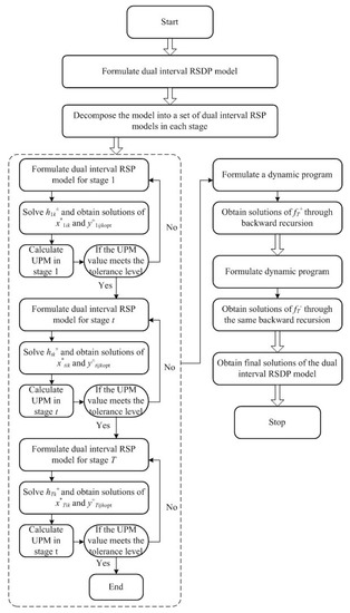 where denotes dual interval flows. Thus, under a given expansion option, Model (21)–(27) can be decomposed into many stages; for each stage, a dual interval RSP sub-problem can be formulated. In order to obtain the solution of Model (21)–(27), the dual interval RSP sub-problem for each stage should firstly be solved. Figure 6 illustrates a general flowchart of the solution for Model (21)–(27), and the detailed solution approach is presented in the next section.