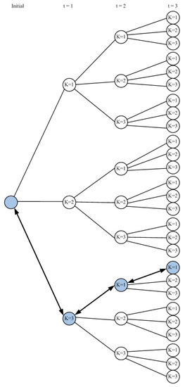 - Get constraint (30) in stage 2 based on the solutions of Model (28)–(33). Then, repeat steps (a) to (h) and obtain the solutions of Model (28)–(33) when t equals 2 under each expansion option (k);