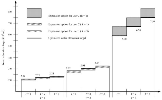 Figure 8 shows the optimized water-allocation targets for the three users in different planning periods. In period 1, the municipal sector would set its water-allocation target at 2.14 × 106 m3 according to the initial (minimum) water demand of 2.00 × 106 m3 and the expansion need of (0.11, 0.14) × 106 m3. It can be seen that the water demand from this sector would be satisfied to the maximum (i.e., 0.14 × 106 m3) since it can bring about high benefits when the demand is met and can be subject to high penalties if the promised water is not delivered. The industrial and agricultural sectors would have their targets be 2.82 × 106 and 5.90 × 106 m3, respectively. These targets may not always be satisfied due to the lower benefit and penalty levels. Since is related to (k + 1) (decision of expansion options at the present stage) and (optimized water-allocation target set at the previous stage), the optimized water-allocation targets for periods 2 and 3 would be: = 2.21, = 2.98, = 6.70, = 2.28, = 3.14, and = 7.50.
