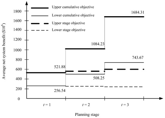 Figure 9 and Table 4 show the objective-function value in each planning period. It can be noticed that the lower bound of would decrease and the upper bound would increase over the entire planning horizon; this implies an increase in fluctuation range of the objective-function value (). For example, when the upper bound of increases from $521.88 × 106 in period 1 to $600.08 × 106 in period 3, the lower bound would decrease from $256.54 × 106 in period 1 to $235.42 × 106 in period 3. This is mainly because the water-allocation targets in each period are set to correspond with in the dual interval RSP sub-problem, making the system take more penalties when water availability is insufficient in dry seasons. At the same time, values of and provide two extremes of the expected net system benefit over the entire planning horizon.