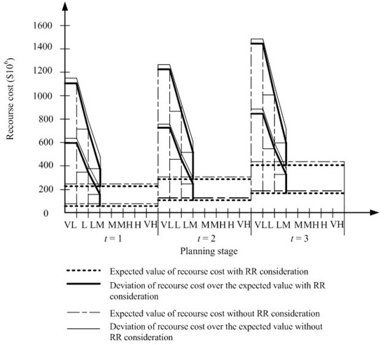 More scenarios can be examined under different UPM tolerance levels in each planning period. In this case, a condition can be specified for limiting the variability of recourse costs to a targeted level. If the obtained solutions are beyond the decision makers’ expectations, new target levels can be further considered and a series of decision alternatives can thus be generated. Meanwhile, the best expansion route in the network could be varied by considering limitations on the deviation of the recourse cost in each planning stage. However, such a consideration could increase computational requirements.