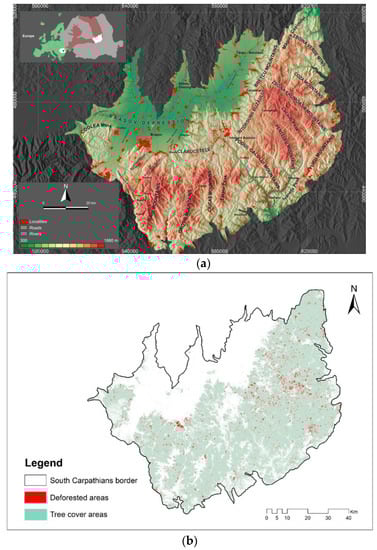 The present study is focused on the Curvature Carpathians in Romania (also known as bend area of Eastern Carpathians), the last mountain division situated on the southern side of Romania. The relief spans from high mountains (Ciucaș Peak elevation: 1954 m) to depressions (Brașov Depression elevation: 500–600 m). The landscape changes from deep forests, in mountainous areas to agricultural land in the Brașov Depression. This intra-mountain depression is one of the largest in the country with Brașov, a city with 227,961 inhabitants in 2011 [31] (Figure 1a). Forests in Romania cover 6.86 million ha (28.8% of the national territory) and show irregular geographical distribution (57% mountain regions, 37% hills and 6% plains) [32]. Among tree species, a mosaic can be identified, with dominant broadleaved species (76%) of beech (Fagus sylvatica), fir (Abies alba), spruce (Picea abies), oak (Quercus robur), ash (Fraxinus excelsior) and pine (Pinus) [32]. In terms of deforestation, the economic need for wood, resulted in pronounced deforestation (Figure 1b).