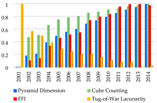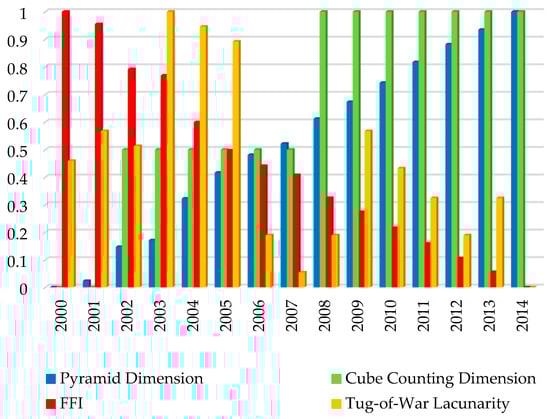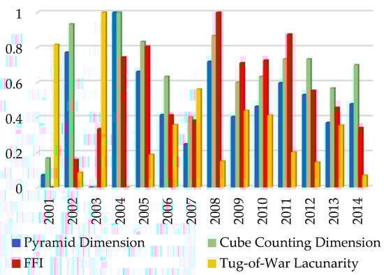 Evolution of fractal indices (standardized values) for the period 2000–2014. Pyramid Dimension (R2 = 0.9922), Cube Counting Dimension (R2 = 0.8187), FFI (R2 = 0.9741) and (R2 = 0.3264). R2 is the coefficient of determination.