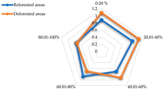 of deforested and reforested areas, by the degree of tree cover canopy.