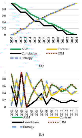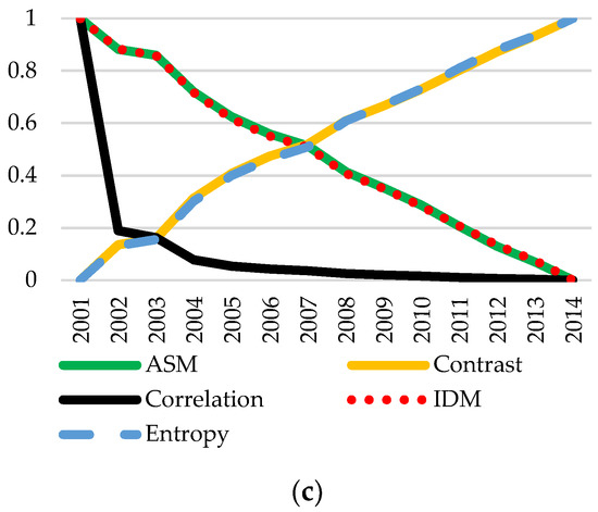 Figure 8a–c shows that the GLCM analysis provided information like the fractal texture complexity analysis obtained through Pyramid Dimension and Cube Counting. The GLCM analysis directly correlated with fractal textural complexity analysis through Entropy and Contrast and vice versa through Correlation, IDM and ASM. Thus, as the textural fractal complexity increases, the clutter increases—entropy, contrast and IDM, but uniformity and correlation decrease. GLCM confirmed that significant changes in the matrix occurred in years with more intense, homogeneous, compact deforestation (2002, 2004, 2005 and 2008) and less significant changes in years with more heterogeneous fragmented deforestation (2001, 2003 and 2007). It was also confirmed that regenerated areas in the 2001–2014 period were relatively evenly distributed when compared to deforestation.