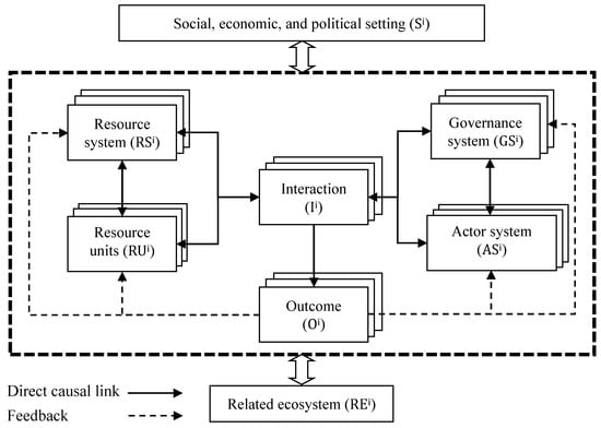 Core framework subsystems for analyzing SES of NRs, adapted from McGinnis and Ostrom []; ‘i’ = variable notation.
