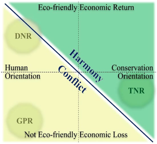 In our scope to develop causable relationship between CF management and village net economic benefit, in relation to conservation [,], the SES framework falls short. It does, however, offer a close connection with collective action theory [,,], common-pool resource theory [,,], and game theory [,,]. A recent study combined the SES framework with the NR—community conflict theory, revealing determinants of the conflicts in the Taibai Mountain National Reserve, China []. As a framework, SES provided the setting for contextual and process variables [,]. The conceptual idea is to elaborate the core framework subsystems and use them to analyze the SES of NRs by way of four parameters: Level of development, economic growth, conservation willingness, and relationship between NRs and village life. We can apply these parameters to measure (or interpret) the role of the SES in our study. In examining this matter, we developed a hybrid psycho-economic model built on the psychological orientation and eco-friendliness to economics (Figure 2). The hybrid psycho-economic model is founded on the basis of Liu et al.’s [] relational categorization of harmonious versus conflictual scenarios. It is presented with reference to the three NR case studies investigated.