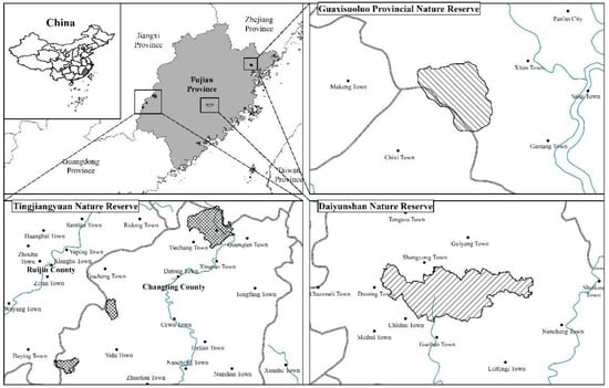 For the study, Fujian Province was selected due to the number of CFs located within its NRs. Fujian is located in South China and is top ranked nationwide in terms of forest coverage (i.e., 63%) in which 89% are CFs []. As a pilot province in CF best practices, Fujian participated in the 2003 CF reforms. At present, the province has 89 NRs, among which 15 are national nature reserves (NNRs), 21 provincial nature reserves (PNRs), 9 municipal level NRs, and 44 county-level NRs []. Three reserves were selected for the study: (1) Changting Tingjiangyuan National Nature Reserve (TNR) (i.e., a less developed reserve) facing minor economic loss, strong willingness to conserve nature, and strong levels of harmony; (2) Dehua Daiyunshan National Nature Reserve (DNR) (i.e., a medium developed reserve) fostering positive economic return, strong willingness to develop, and low levels of conflict; and (3) Fu’an Guaxisuoluo Provincial Nature Reserve (GPR) (i.e., a highly developed reserve) coping with large economic loss, very strong willingness to develop, and very high levels of conflict (Figure 3). The NRs were chosen from a workshop held in Fujian with NR management experts and officials as well as provincial administers in the first week of July 2018. Criteria for case selection relied on data representation and availability in conjunction with the hybrid psycho-economic model inference (i.e., each NR having a different harmony–conflict status).